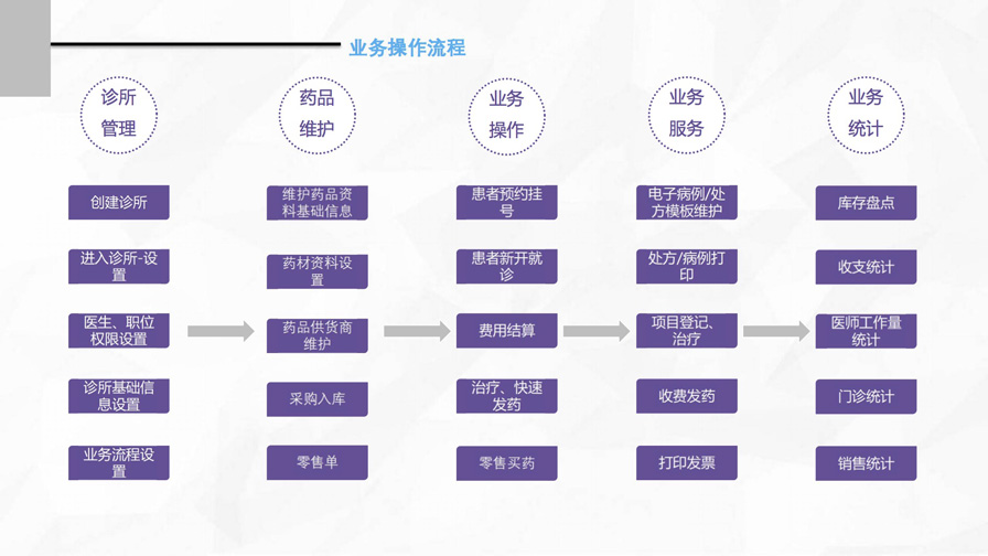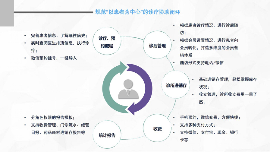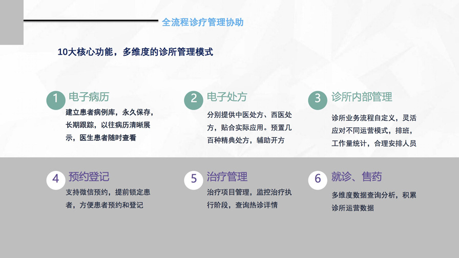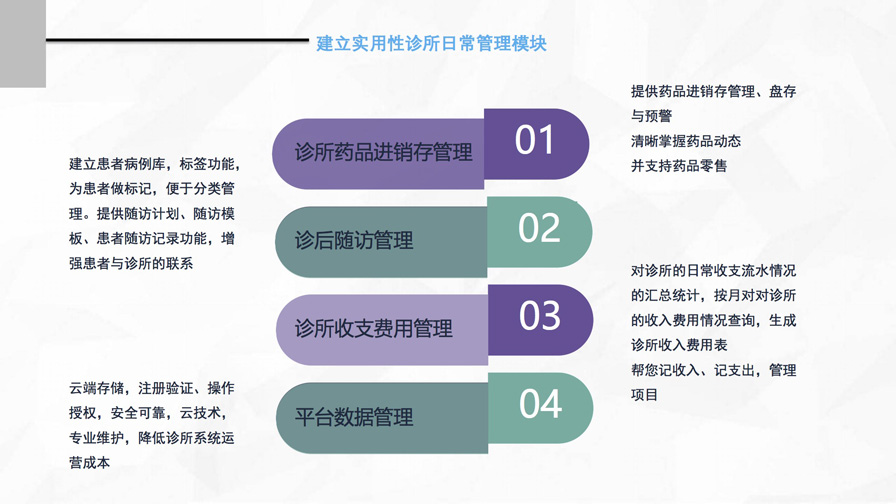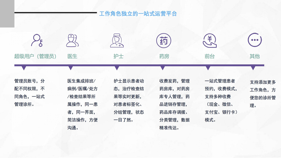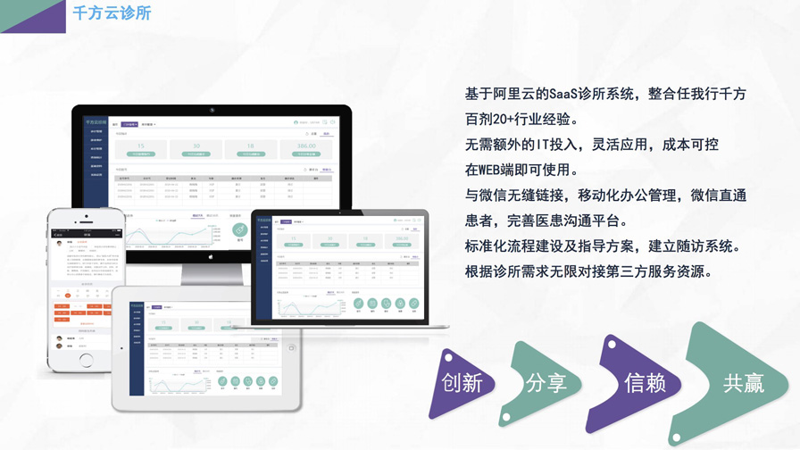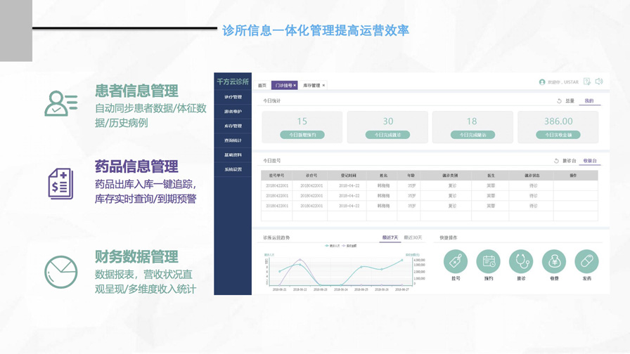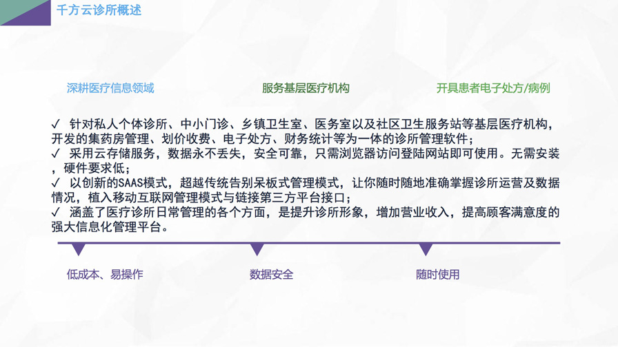 千方云诊所是集药房管理、划价收费、电子处方、财务统计、中医智能诊断等为一体的诊所管理软件。采用云存储服务,数据永不丢失,安全可靠,只需浏览器访问登陆网站即可使用。